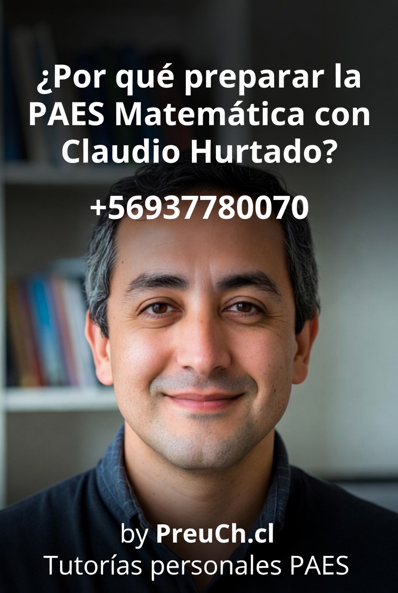 Si buscas un enfoque personalizado y efectivo para preparar las pruebas PAES de Matemáticas en Chile, preuch.cl, ¡no dudes en contactarme! Claudio Hurtado clases preparación PAES MATEMÁTICA y PAES FÍSICA clasespaesmatematica@gmail.com Estoy listo para ayudarte a alcanzar tus objetivos académicos y lograr el éxito en tus exámenes.