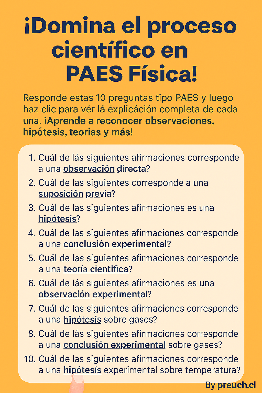 En PAES Física, muchas preguntas se basan en el proceso científico. Aquí te mostramos cómo diferenciar cada concepto y cómo enfrentarlo con seguridad. Tips para enfrentar preguntas PAES sobre el proceso científico. Observaciones Suposiciones previas Hipótesis Conclusiones Teoría Antes de responder, pregúntate: ¿Esto se midió, se asumió, se predijo, se concluyó o se validó muchas veces? Esa pregunta te guía directo a la alternativa correcta.