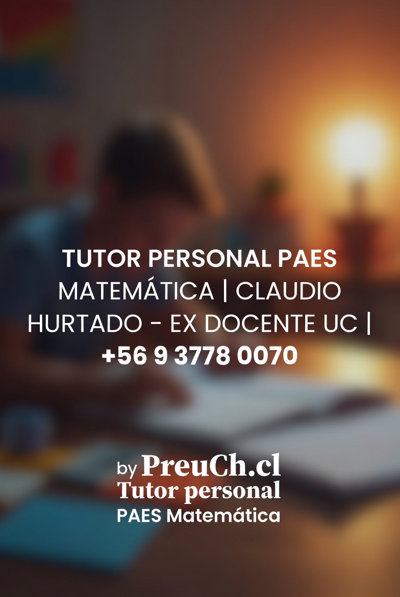 TUTOR PERSONAL PAES MATEMÁTICA M1 Y M2 CHILE | CLAUDIO HURTADO EX DOCENTE UC | +56 9 3778 0070 | WWW.PREUCH.CL ¿Buscas aprobar la PAES de Matemática y entrar a la universidad de tus sueños? ¡Prepárate con el mejor! Claudio Hurtado, ex docente de la Pontificia Universidad Católica de Chile y especialista con más de 20 años de experiencia, ofrece clases particulares personalizadas de PAES Matemática M1 (General) y M2 (Optativa) para el Proceso de Admisión 2026 en todo Chile. 📍 (…)
